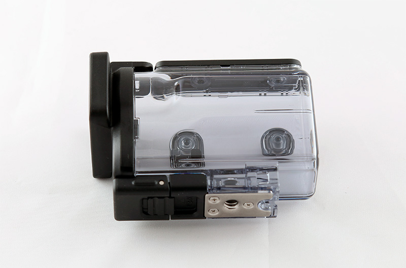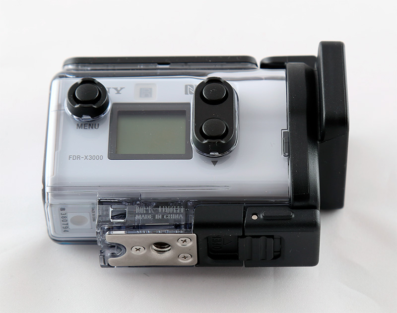 Камера без защитного бокса. Маленький дисплей служит только для настроек, для фиксации изображения служит или приложение на смартфоне, или внешний дисплей. Рядом с дисплеем расположена кнопка вызова меню и кнопки перемещения вверх-вниз по пунктам меню.