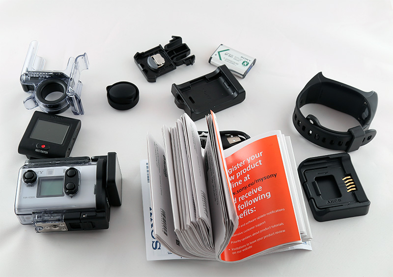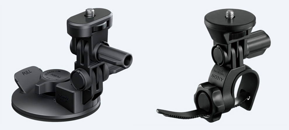 Для этой камеры Sony выпускает целую кучу аксессуаров, включая самые разнообразные варианты крепления: клипса на кепку, крепление на голову, нагрудное крепление, крепление на трубу/раму, зажимное крепление с удлиннителем, крепление к рюкзаку, крепление на доску, резиновая суперприсоска (например, для автомобиля), ручка для съемки, монопод.