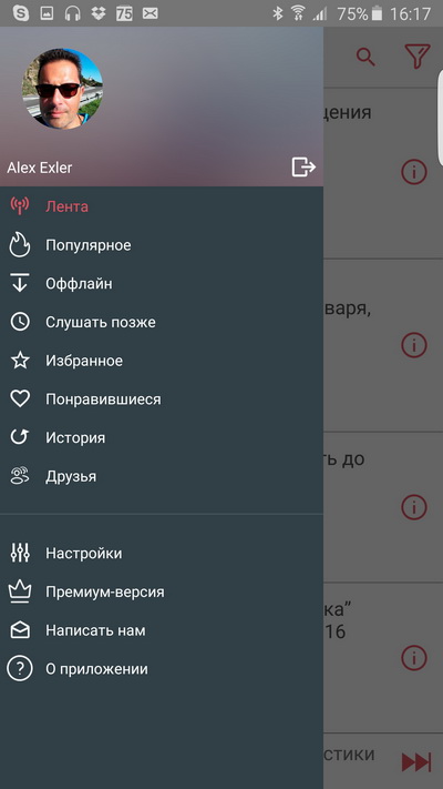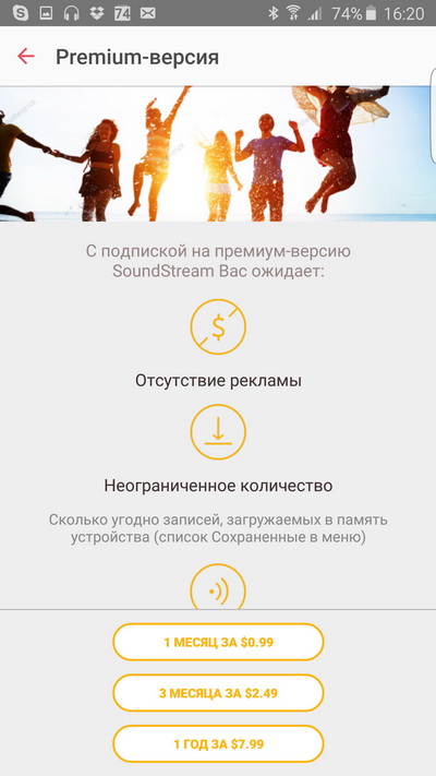 Премиум-версия - вы можете перейти на платную версию, где не будет никакой рекламы, в память устройства можно загружать неограниченное количество записей (в бесплатной версии объем ограничен 6 Гб), также там будет доступна возможность скачивать и воспроизводить подкасты в высоком качестве.