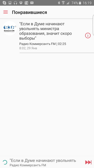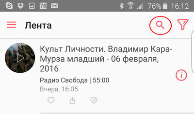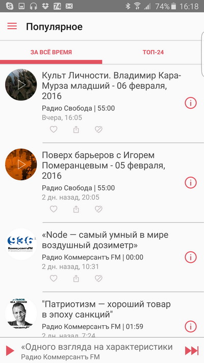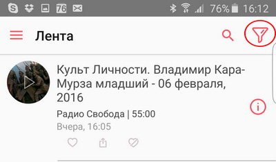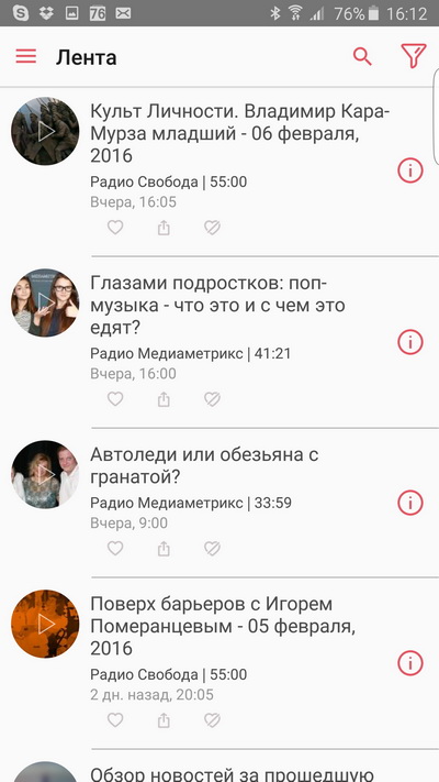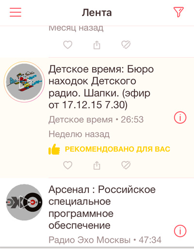 После того как темы и источники выбраны, сервисом можно пользоваться: вы попадаете в ленту подкастов (передач), сформированных в соответствии с вашими интересами.