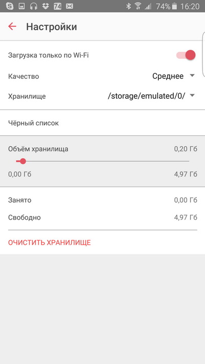 Хранилище - выбор хранилища для скачанных роликов: память смартфона, память карты microSD (если смартфон ее поддерживает).