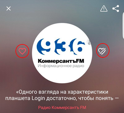 Слева/права от логотипа радиостанции - пиктограммы "Нравится" и "Не нравится". С помощью "Нравится" отмечаете понравившиеся передачи, после чего система начнет вам рекомендовать какие-то новые программы на основе этих отметок.