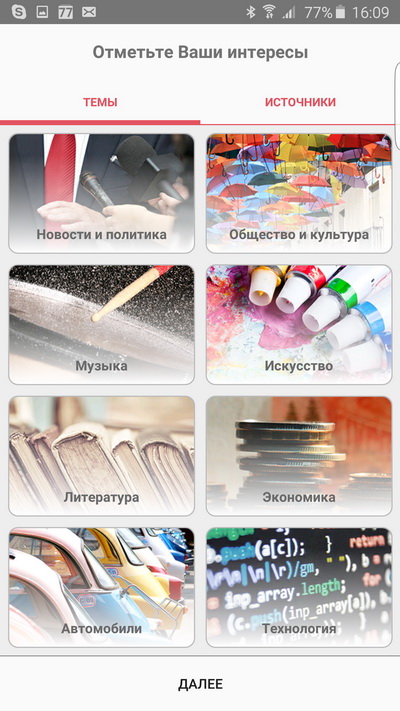 Сначала отмечаете интересующие вас темы: в приложении каталог тем содержит 34 раздела.