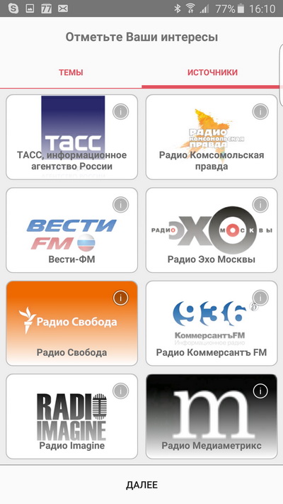 Далее выбираете интересующие вас источники. Их количество зависит от того, какие темы вы выбрали. Если выбраны все темы - вам покажут все источники, которых там сейчас 216. В дальнейшем, разумеется, все это можно будет неоднократно корректировать - как темы, так и источники.