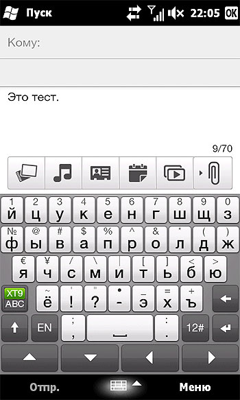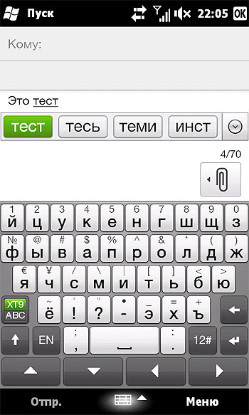 На HD2 SMS-диалог выглядит не так эффектно (хотя и вполне функционален), но зато радуют подстановка слов в момент набора и более широкие возможности прикладывания файлов к сообщению (особенно полезно это в электронной почте).