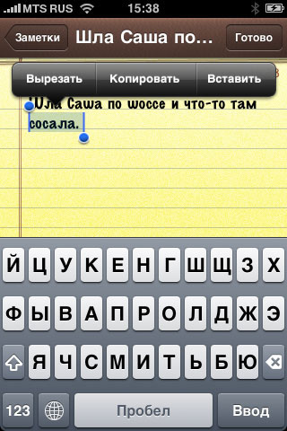 Вот с копированием-вставкой преимущества iPhone на данный момент несомненны. С третьей прошивки там наконец-то появилась возможность копирования-вставки (до нее этой возможности не было как класса, что крайне веселило недругов Apple), причем решена эта задача была в свойственном Apple изящном и очень эффектном стиле: если нажать пальцем у какого-то символа и подержать, то появляется меню работы с буфером. Кроме того, с помощью очень удобных значков выделение можно редактировать. Также при кратковременном нажатии пальцем на какой-то символ появляется экранная лупа, позволяющая очень точно позиционировать положение курсора.