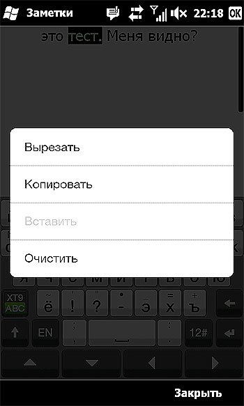 В Windows Mobile эта возможность существовала изначально, но была рассчитана на работу со стилом. Поэтому на данный момент выделять пальцем какие-то слова и фразы заметно неудобнее, чем в iPhone. Там, правда, есть какие-то костыли - при постукивании по экрану сначала выделяется целиком слово, на котором стоит курсор, а при втором постукивании - вся строка, но тем не менее пользоваться пока неудобно. Это надо решать на уровне самой операционной системы.