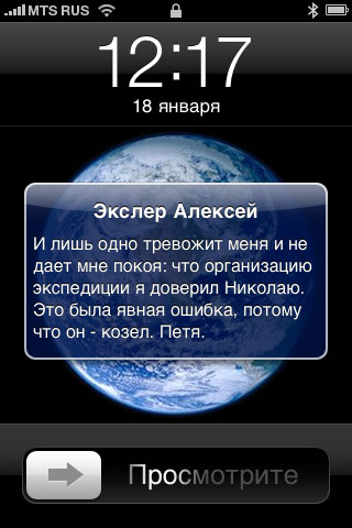 Ну и, кстати, явный плюс iPhone заключается в том, что он может поступившее сообщение вывести прямо на экран блокировки и там доступны кнопки просмотра сообщения или ответа на него. У Windows Mobile на экране блокировки (спертом, кстати, именно у iPhone, только спертом не слишком удачно) вы можете увидеть только информацию о том, что поступили какие-то SMS или какие-то звонки. (Впрочем, у Windows Mobile с экрана блокировки вы сразу можете попасть в подсистему SMS или журнал звонков, если были пропущенные сообщения или звонки, - у iPhone этого нет.)