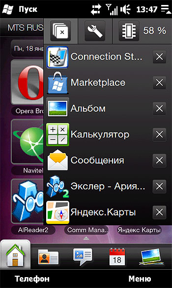 Если Windows Mobile изначально была многозадачной (даже чересчур многозадачной, потому что при "закрытии" приложений они реально не выгружались, а только минимизировались), то iPhone OS принципиально однозадачная - вплоть до последних прошивок и iPhone 3GS. Разработчики объясняют это экономией аккумулятора, но точно так же можно ссылаться на пятна Солнца - объяснение совершенно дурацкое. Единственное, что в iPhone умеет работать в фоне, - это плеер. Все остальные радости многозадачной жизни тут недоступны: запустили приложение, работаете с ним, а если нужно запустить какое-нибудь другое приложение - тыкаете в единственную айфонную кнопку Home, приложение закрывается, после чего выбираете пиктограмму другого приложения.