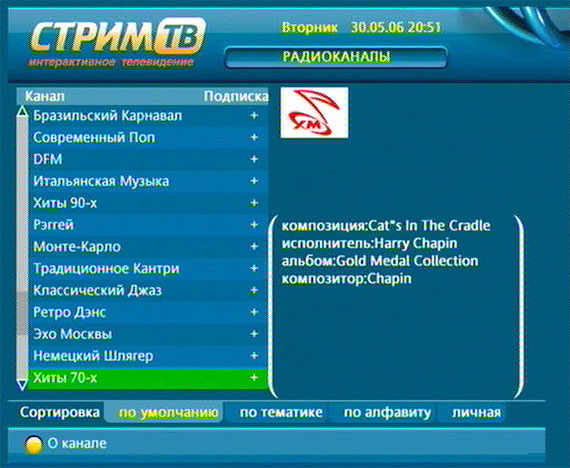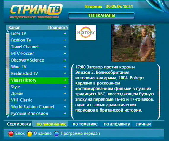 Надо отметить, что программное обеспечение для работы с каналами - достаточно удобное, информативное и наглядное. Список каналов можно сортировать по умолчанию, по тематике (познавательные, развлекательные, детские, кино, музыка, новости, российские каналы, спорт и так далее), по алфавиту, а также по собственным предпочтениям - в этом случае вы можете с помощью пульта достаточно легко и быстро менять последовательность каналов в списке. Личная сортировка каналов сохраняется даже при отключении декодера от питания.