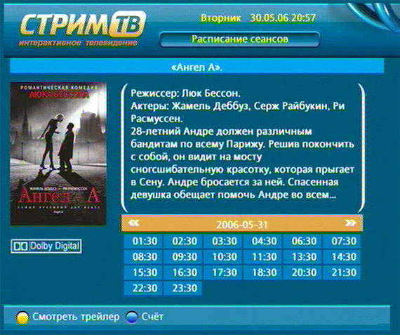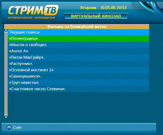 Вы можете заказать любой понравившийся вам сеанс (в день идет 216 сеансов, все фильмы из списка запускаются практически раз в час), при этом с вашего личного счета будет списана стоимость показа - $1,95.