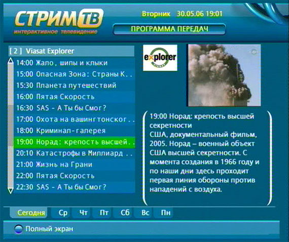 При этом в правой части экрана дается подробное описание выбранного пункта программы, а с помощью курсоров пульта вы можете выбирать программу на конкретный день недели.