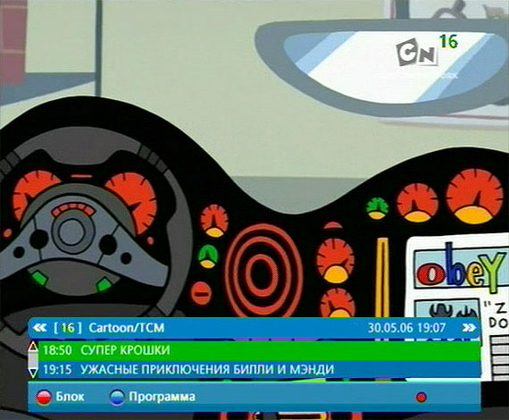 Через пять секунд информационная строка пропадает, но ее в любой момент можно вызвать нажатием кнопки "ОК". В информационной строке можно двигаться вверх-вниз по программе передач данного канала, также можно переключать данные программы на предыдущий и следующий каналы.