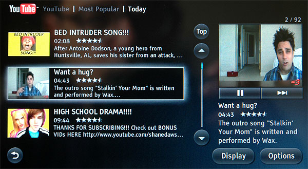 Несколько видеосервисов, включая Youtube, несколько интернет-каналов, подкасты-видеокасты, поиск видео в Интернете. Ищет, кстати, очень паршиво. Я задал строку для поиска - нашли только один клип, причем с нечетким совпадением. Та же строка, введенная в поиск клипов в "Гугле", выдала 10 000 результатов.