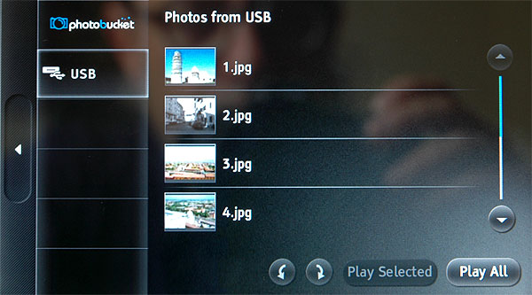Просмотр изображений с Photobucket, с USB-накопителя. Слайд-шоу - совершенно примитивное, нет никаких настроек: изображения показываются по 5 секунд и сменяются боковым сдвигом.