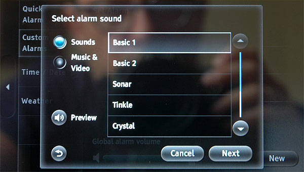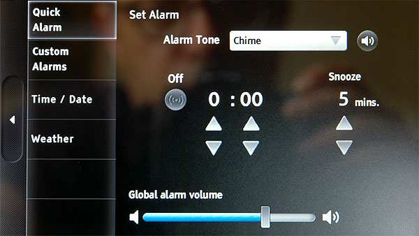 В продвинутом режиме настроек можно задавать несколько будильников, у каждого из которых задаются расписание (например, звонить только с понедельника по пятницу), время, период досыпона, звук. Также вместо звука можно задать радио или видеоканал, которые начнут воспроизводиться при срабатывании будильника. Возможности задать свою музыку для будильника здесь нет - видимо, из-за того, что у устройства нет внутренней памяти для файлов.