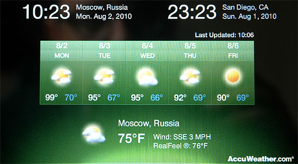 Если городов задано несколько, их можно переключать с помощью стрелок снизу. Независимо от текущего города, данные которого показываются слева сверху, справа сверху показываются время и дата города Сан-Диего. С чего ему такая честь - непонятно. Я сначала думал, что там находится штаб-квартира Sony, но она расположена в Калверсити.
