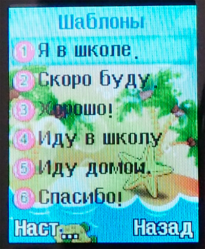Телефон умеет принимать и отправлять SMS (тоже только с указанных номеров и на указанные номера). На такой клавиатуре текст набирать невозможно, поэтому для ребенка доступны шаблонные сообщения, которые могут редактировать родители.