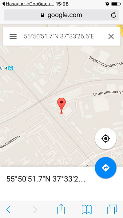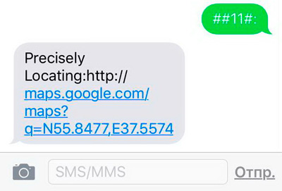 Ну и самое главное - родители в любой момент могут посмотреть местоположение телефона (и, соответственно, ребенка) или в онлайне на специальном сайте по IMEI телефона и паролю (при этом на телефоне должен быть включен GPRS, который будет потреблять немало мобильного трафика), или отправив по SMS код запроса координат GPS, который выглядит вот так: "##11#:". (Напоминаю, что и звонки, и SMS с телефонов, которые не записаны родителями в самом аппарате, телефон игнорирует.) В ответ координаты приходят в таком формате, чтобы по ним можно было щелкнуть - и получить точку в Google Map.