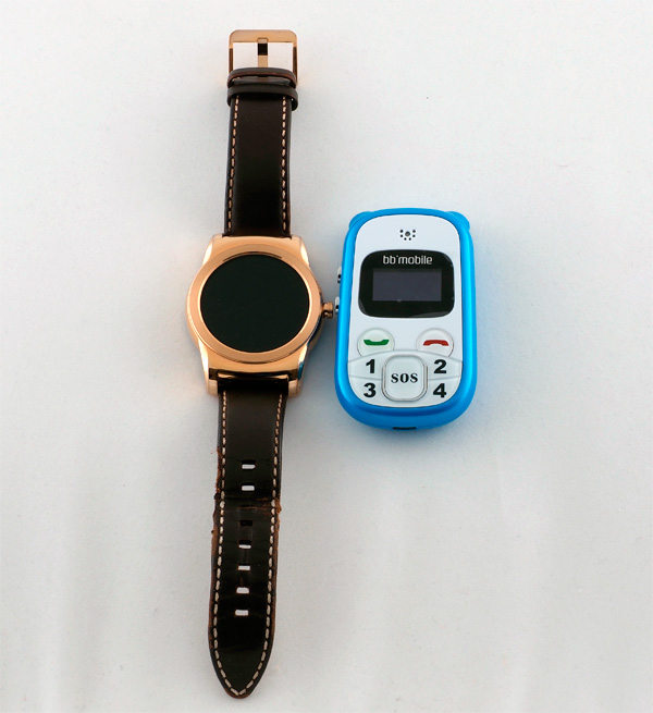 Сравнение габаритов устройства с часами - телефон реально очень маленький.