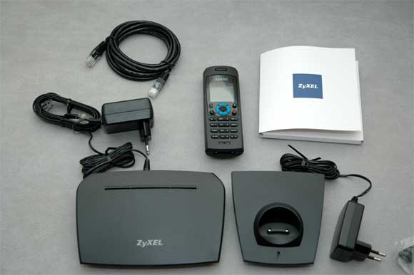 В комплектацию устройства входят: базовое устройство с блоком питания, Ethernet-кабель, телефонный кабель, телефонная трубка, крэдл с блоком питания для трубки, клипса для ношения трубки на поясе и руководство пользователя.