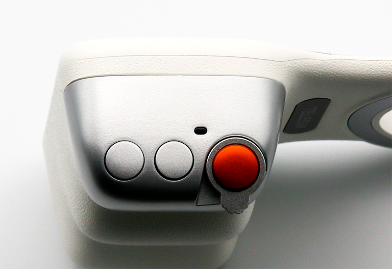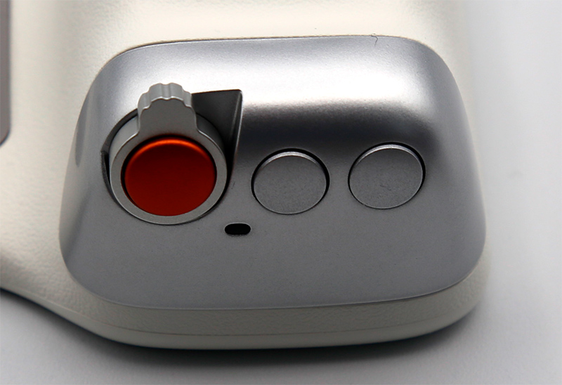 Управляющие клавиши: красная кнопка - включение и выключение (длинное нажатие), съемка фото или видео (обычное нажатие), фокусировка (легкое нажатие), переключение между тыловой и фронтальной камерой (двойное легкое нажатие), и у кнопки есть рычажок для зума; остальные две кнопки позволяют переключаться между режимами съемки вперед и назад. Также на блоке есть светодиод, который мигает зеленым, когда блок входит в режим сопряжения по Bluetooth.