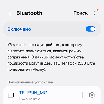 Держатель сопрягается со смартфоном по Bluetooth точно так же, как и другие устройства с Bluetooth. При первом включении держатель входит в режим сопряжения, в списке устройств надо найти TELESIN_MG и подключить его.