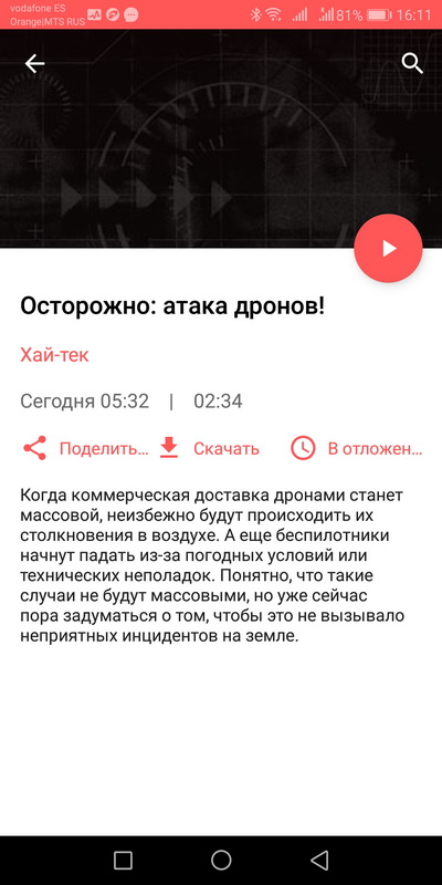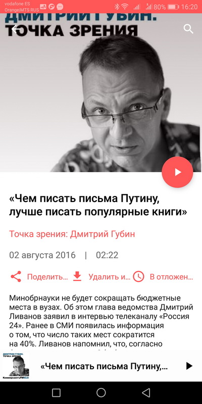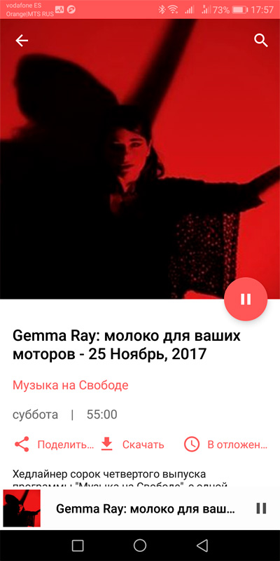 Выбираем интересующий выпуск, нажимаем, попадаем в плеер. Там, как мы уже выяснили, можно прослушивать передачу в онлайне, скачать ее для прослушивания в офлайне, отправить в отложенные.
