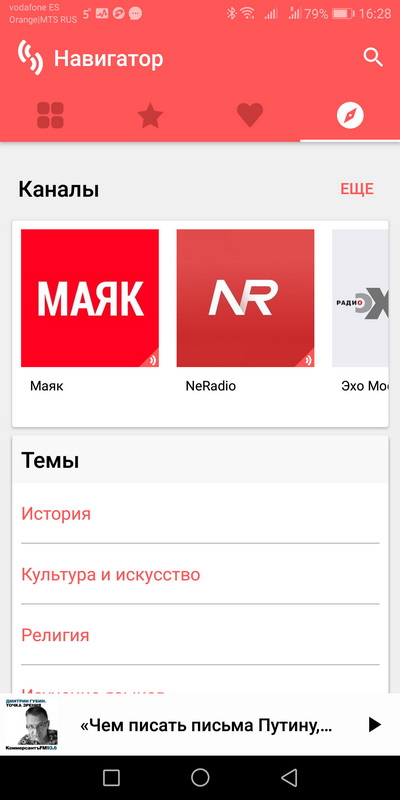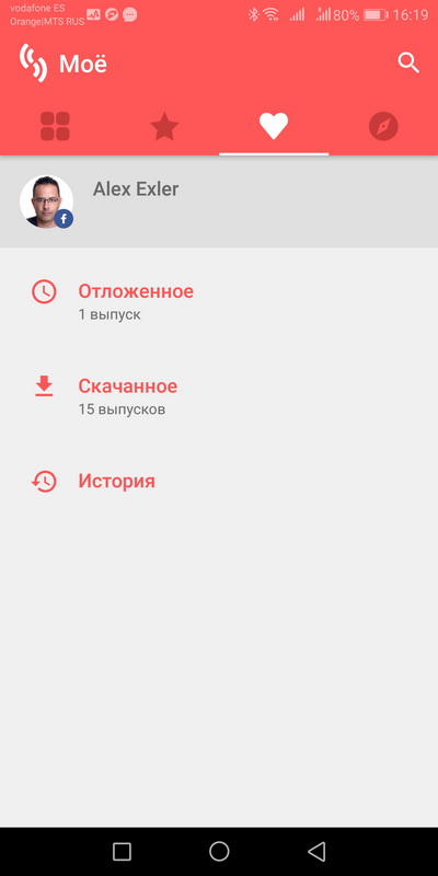 Скачанные и отложенные передачи, а также история прослушивания хранятся в соответствующем разделе "Моё".