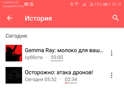 "История прослушиваний" - полезная штука для ситуаций, когда вы что-то не успели дослушать: там также отмечается время прослушивания тех или иных передач, причем в отличие от раздела "Скачанное" тут выводятся только те передачи, которые вы хотя бы раз запускали.