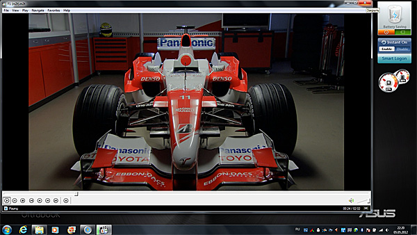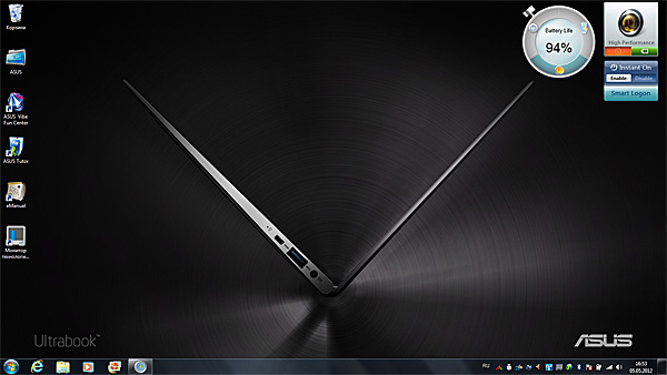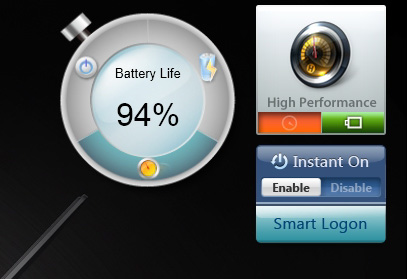 Из дополнительных приложений на десктопе - три виджета: Battery Life (дней работы в режиме Standby, часов работы в текущем режиме, часов для заряда, часов работы в различных режимах - игры, офис, видео, Интернет), виджет переключения режима работы от батареи (производительность, экономия энергии), виджет оптимизации работы и кнопка настройки быстрого логина по лицу - SmartLogon.