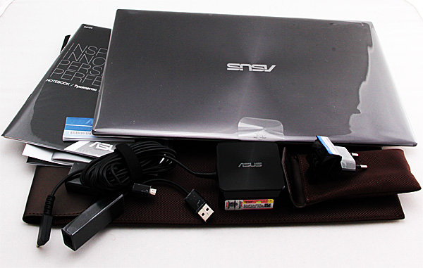 Комплектация тут явно побогаче, чем у большинства остальных ультрабуков: устройство, адаптер питания, два переходника для HDMI и VGA, кожаный чехол для переходников, кожаный чехол для ультрабука, книжечки, софт.