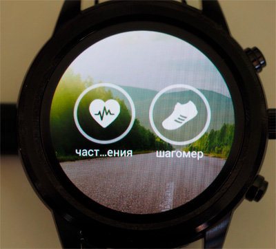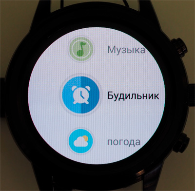 При сдвиге вправо-влево появляются определенные приложения: телефон, уведомления, музыкальный плеер, здоровье (измерение пульса и шагомер), погода.