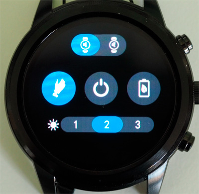 Окно настроек при длинном нажатии центральной кнопки: звук, выключение, экономия энергии, яркость дисплея.