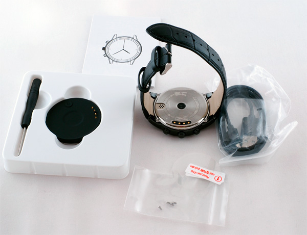 Комплектация: часы, кабель USB-microUSB, крэдл для зарядки, отвертка для откручивания болтов крышки, запасные болты, защитная пленка на дисплей часов.