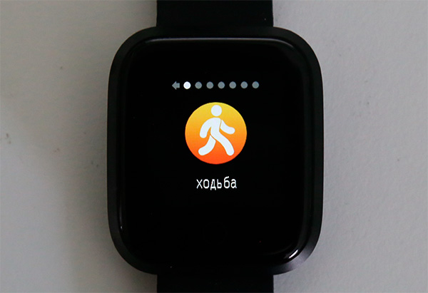 Там длинное нажатие - подменю тренировок: ходьба, бег, велосипед, скакалка, бадминтон, баскетбол, футбол. Странноватый набор, конечно.