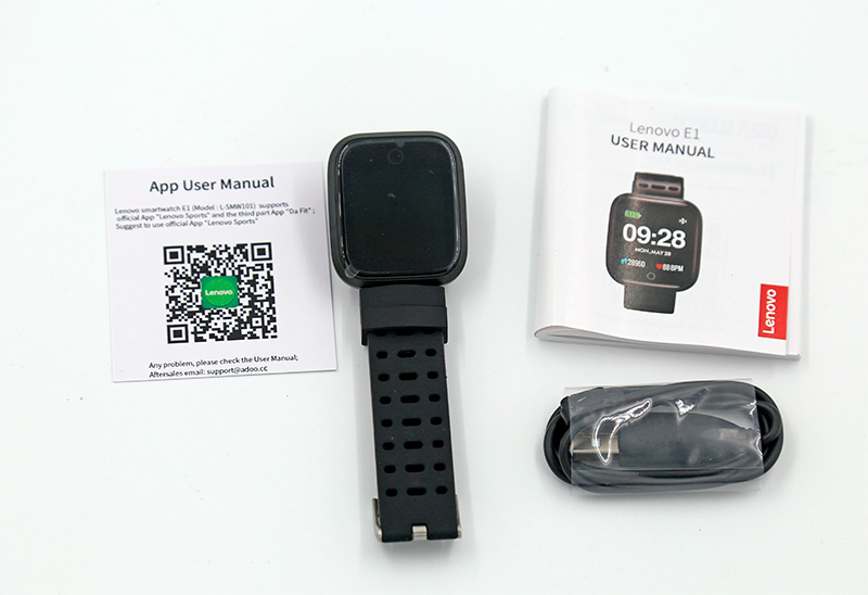 Часы с ремешком, кабель для зарядки, руководство пользователя на нескольких языках, бумажка с QR-кодом приложения Lenovo Sport для смартфона.