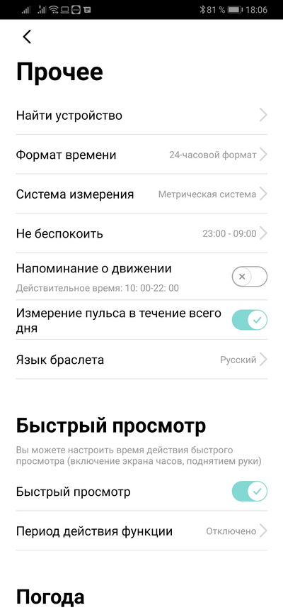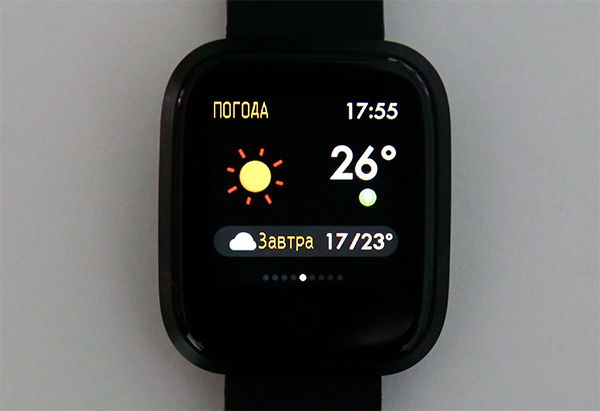 Возвращаемся в основное меню. Следующей идет погода (город выбирается в приложении на смартфоне).