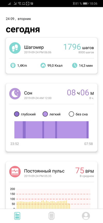 Основной экран приложения. Шаги, сон, пульс, занятия спортом.