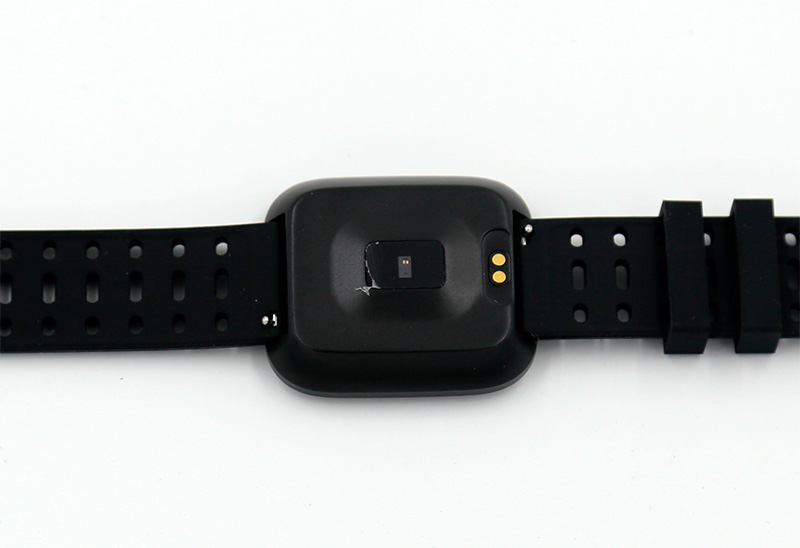 На нижней части - контакты для зарядки и датчик пульса, накрытый пленкой, которую нужно снять.
