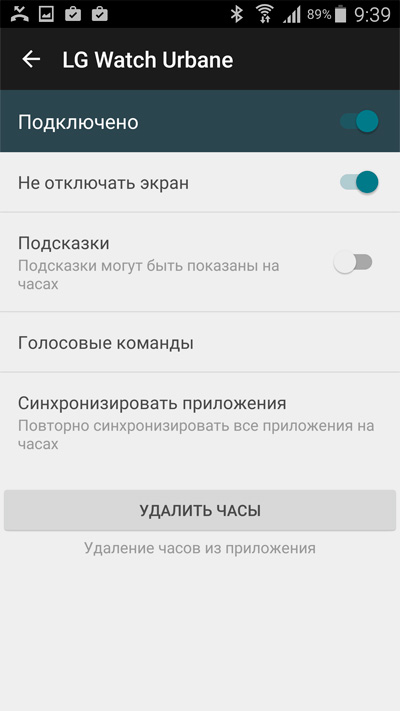 После этого можно войти в настройки и поменять пару опций. Лично я сразу отключаю подсказки (они только загромождают экран часов) и включаю экран в постоянном режиме. Кстати, чтобы добраться до этих опций, нужно в окне настроек щелкнуть по названию часов (LG Watch Urban) - это не слишком очевидно и многие пользователи не знают, как это делается.