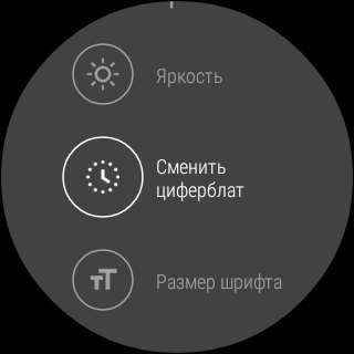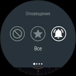 Движение пальцем вниз по циферблату вызывает область настроек. Первым делом там появляется настройка оповещений (там же на пару секунд появляются цифры уровня заряда аккумулятора). Теперь вы можете включать все оповещения, только важные, выключать их вообще.