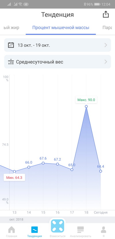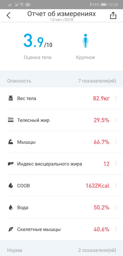 При каждом измерении показываются все параметры и отмечается, насколько они отличаются от нормы. Замечу, что для получения этих данных используется метод биоимпеданса: через тело пользователя пропускается небольшой ток. За счет него за 3-4 секунды измеряется 12 биометрических параметров: вес, общий процент жировых тканей, индекс висцерального жира, содержание белка, базальный метаболизм (основной обмен веществ), мышечная масса, костная масса, процент воды, ИМТ, тип тела, возраст тела, масса скелетных мышц.