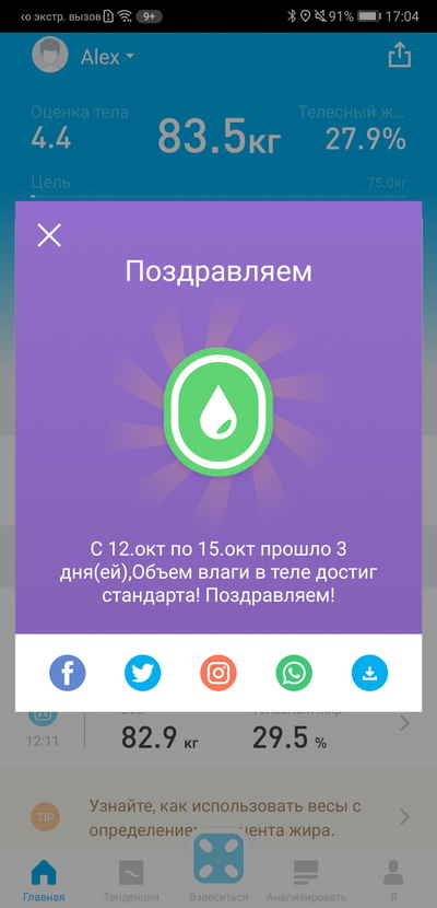 Весы следят за изменениями параметров и сообщают, когда тот или иной параметр достиг нормы. У меня объем влаги в теле достиг стандарта - за это надо немедленно увлажниться!