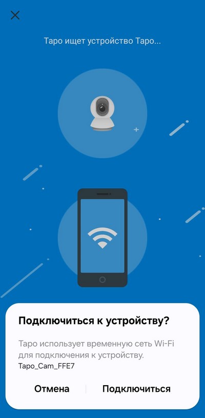 Приложение само обнаружит камеру и предложит подключиться к созданной ею сети, чтобы настроить устройство. После этого надо будет выбрать тип устройства и его модель.