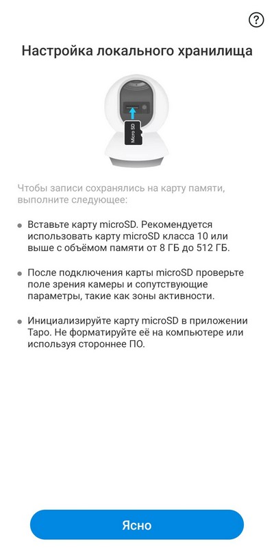 Камера может хранить снятые фото и видео в специальном безлимитном облаке Tapo Care (30 дней даются бесплатно на пробу, далее нужно приобрести подписку), также она может хранить записи на карте памяти.