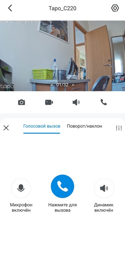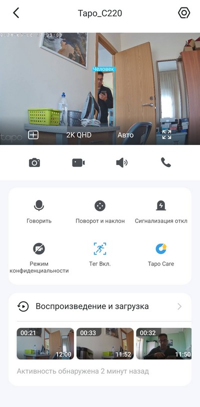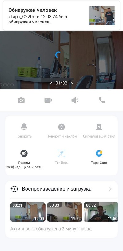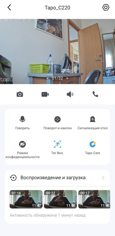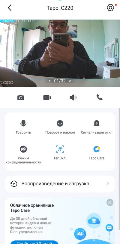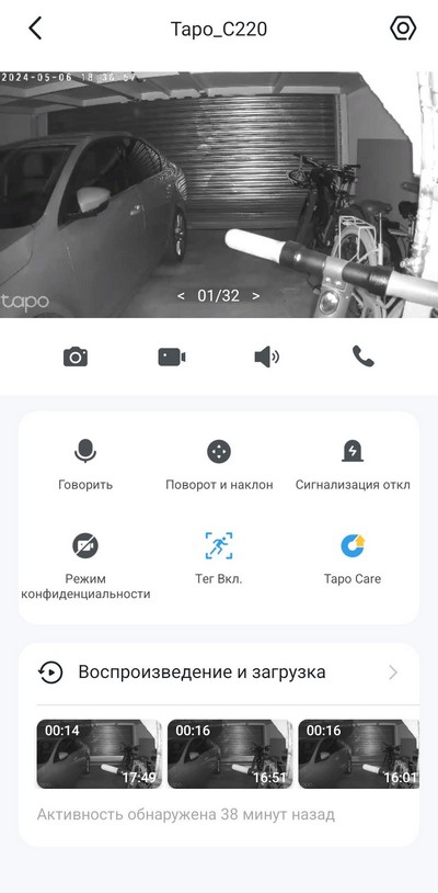 Главное окно камеры. Трансляция потока, съемка фото и видео, включение/выключение динамика, вызов абонента, находящегося рядом с камерой. Также прямая аудиосвязь через камеру, регулировка поворота и наклона объектива, включение сигнализации (при обнаружении заданной активности камера может мигать светом и издавать громкие звуки), включение режима конфиденциальности (трансляция и запись полностью прекращаются), тэгирование обнаруженной активности, облако Tapo Care.