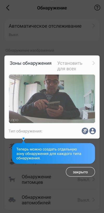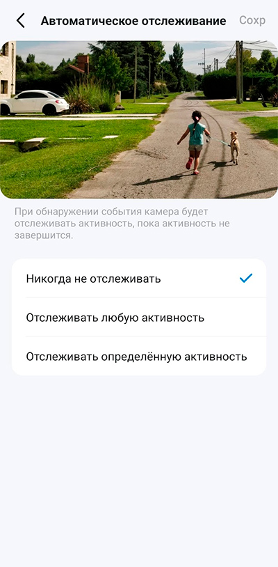 У камеры также есть режим автоматического отслеживания: при обнаружении какой-то активности (из заданных), камера будет следовать за объектом, пока он не пропадет из поля зрения, после чего вернется к своему первоначальному положению.