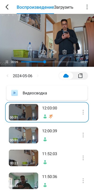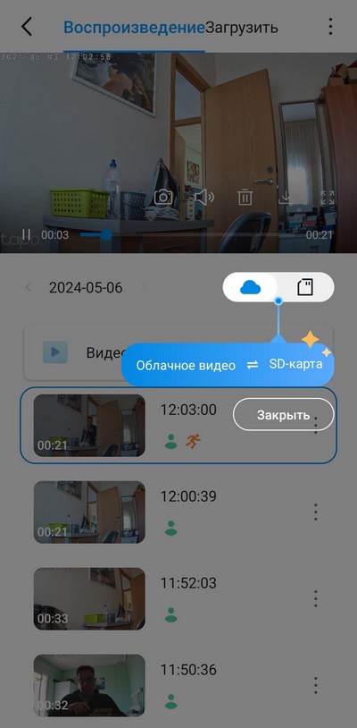 При воспроизведении роликов вы можете выбирать источник - карта памяти или облако.
