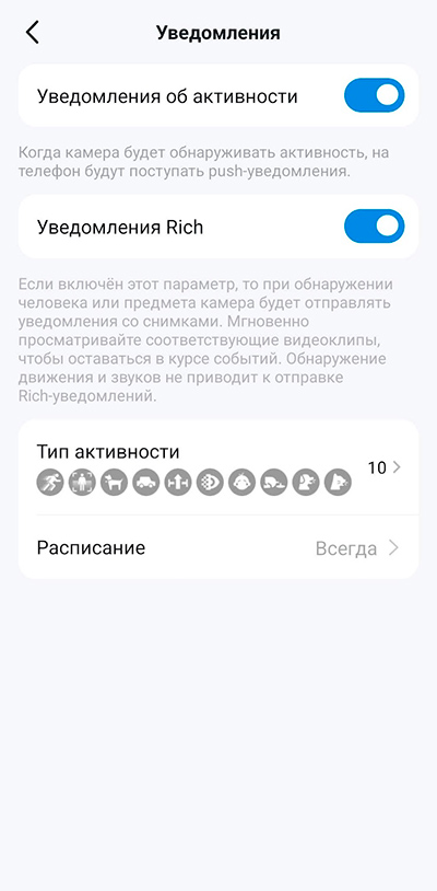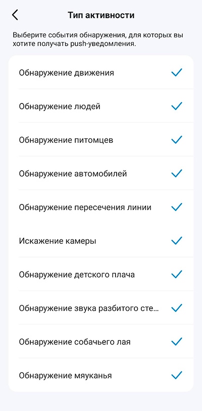 Встроенный ИИ может различать различные виды активностей: просто движение, людей, животных, автомобили, пересечение заданной линии, перемещение камеры, детский плач, звук разбитого стекла, собачий лай и мяуканье. И вы сами выбираете, на какие виды активностей вам нужно присылать уведомления и в какой период времени.